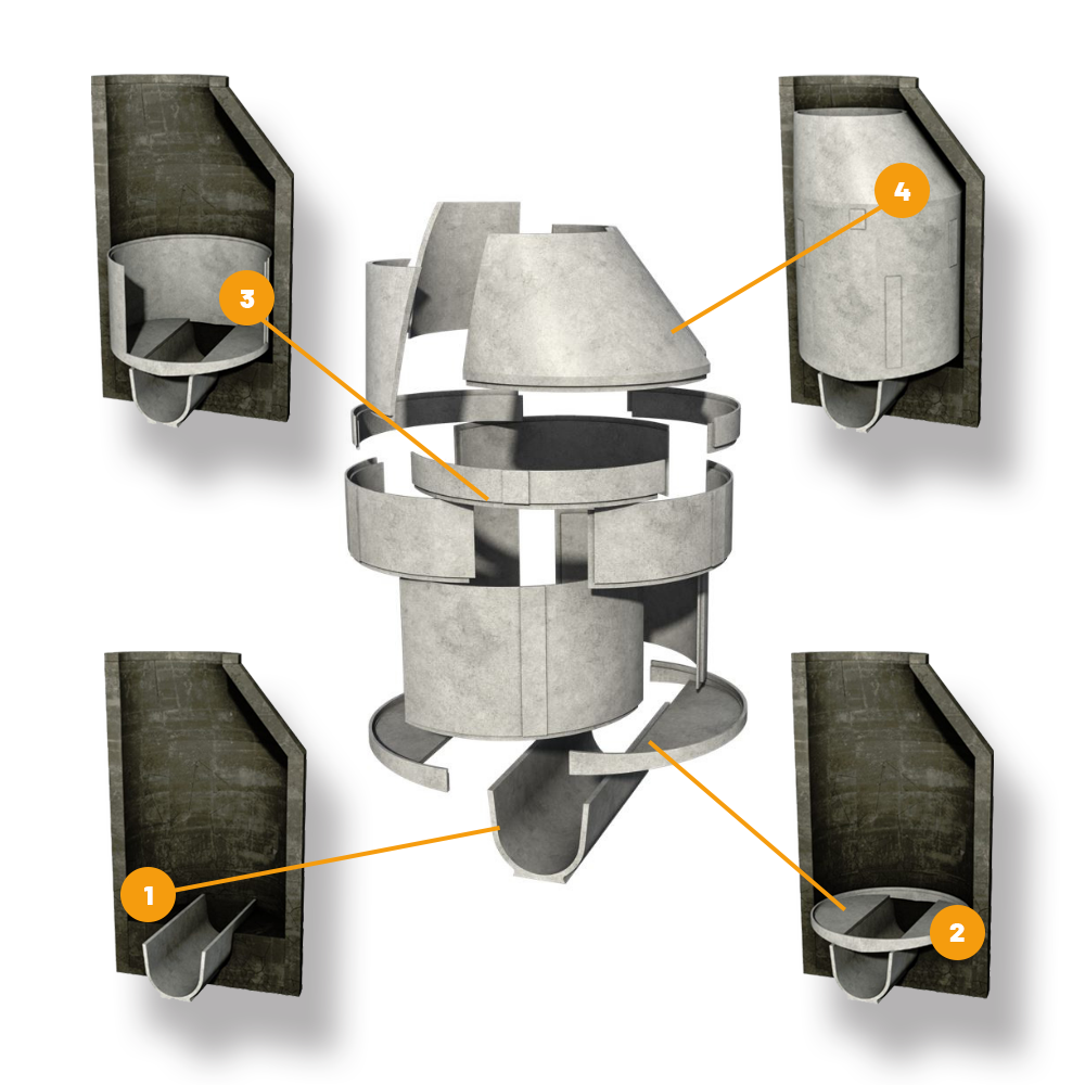 Für die Sanierung von kreisrunden Schächten nutzen wir ein Verfahren, das seit langer Zeit erfolgreich im Tunnelbau eingesetzt wird: Bei der Tübbing-Bauweise werden die aufgehenden Schachtringe mit dreiteiligen Elementen ausgekleidet. Dabei ist die materialbedingt mögliche Dünnwandigkeit von besonderem Vorteil, weil dadurch ein Maximum an lichtem Raum erhalten bleibt (z. B. Schacht DN 1000 nach der Sanierung lichte Breite von 900). Auch für die übrigen Bereiche des Schachtes gibt es präzise gestaltete Elemente.